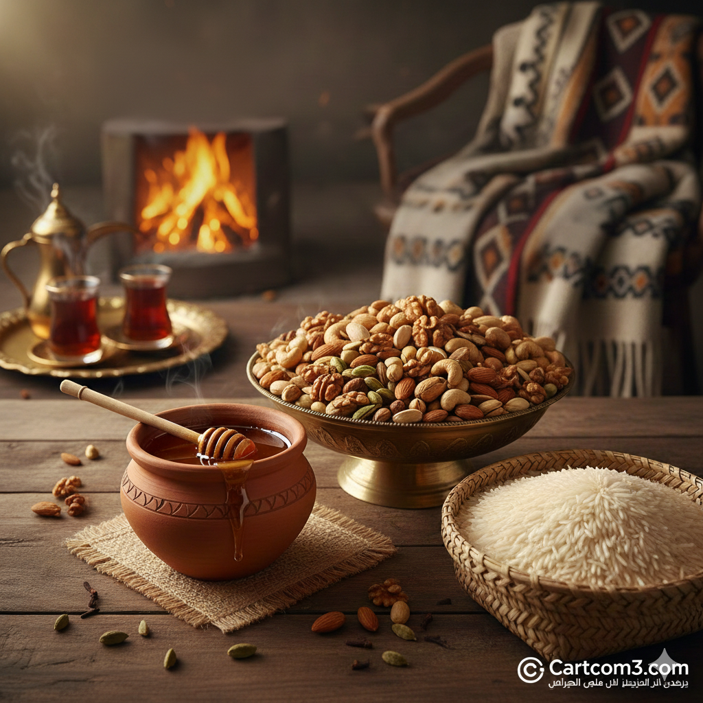 لا تحلو “الدوة” أو جلسات السمر الشتوية في المخيمات بدون طبق المكسرات المشكلة. هي ليست مجرد تسلية، بل هي مصدر غني بالدهون الصحية والبروتينات التي تساعد الجسم على البقاء دافئاً لفترات طويلة.